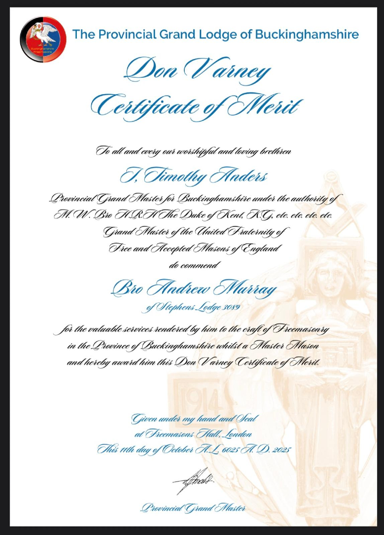 - This year awarded to Brother Andrew Murray of Stephens Lodge 3089