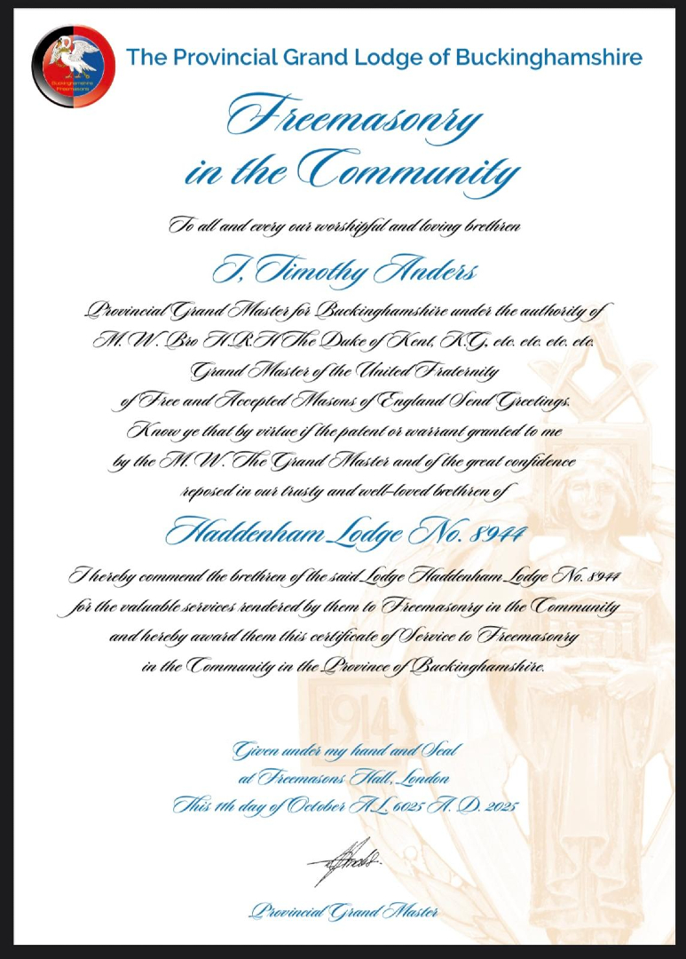This prestigious honour recognises the recipient for their unwavering commitment, outstanding service and remarkable contributions to Buckinghamshire Freemasonry.  It acknowledges individuals who have consistently demonstrated extraordinary efforts in their rolls exceeding expectations.  It celebrates their invaluable contributions not only to Freemasonry but also the achievement of the Provincial strategic goals.