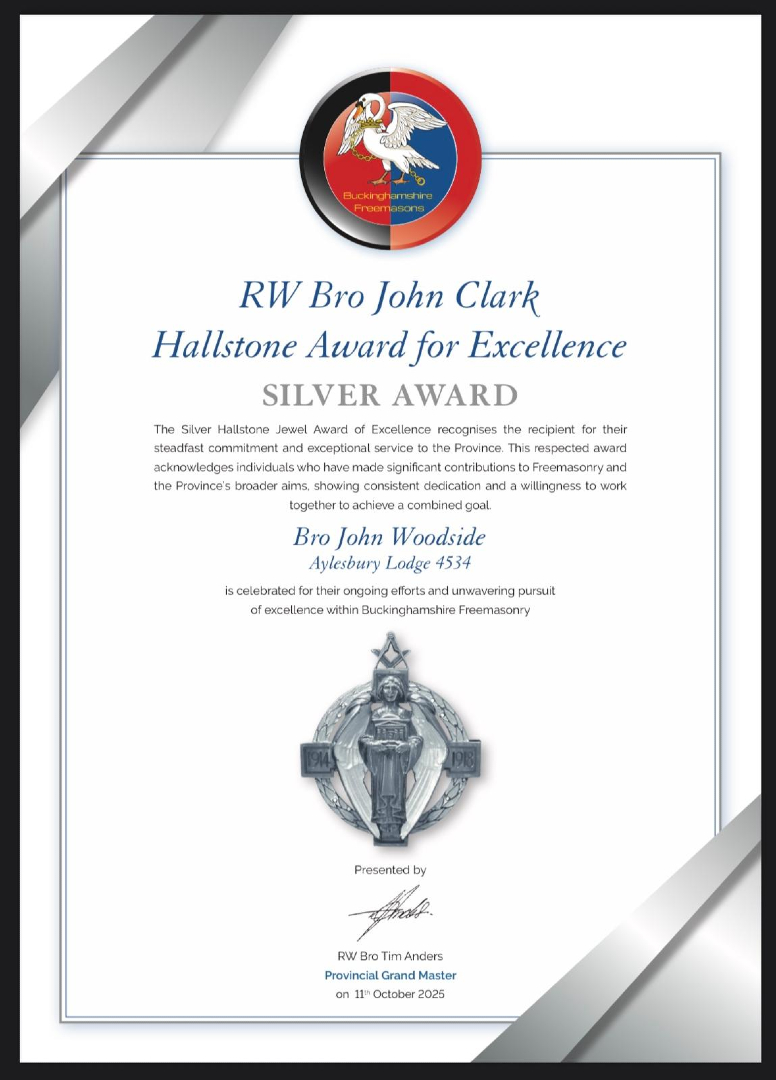 - This year awarded to Brother John Woodside of Aylesbury Lodge 4534