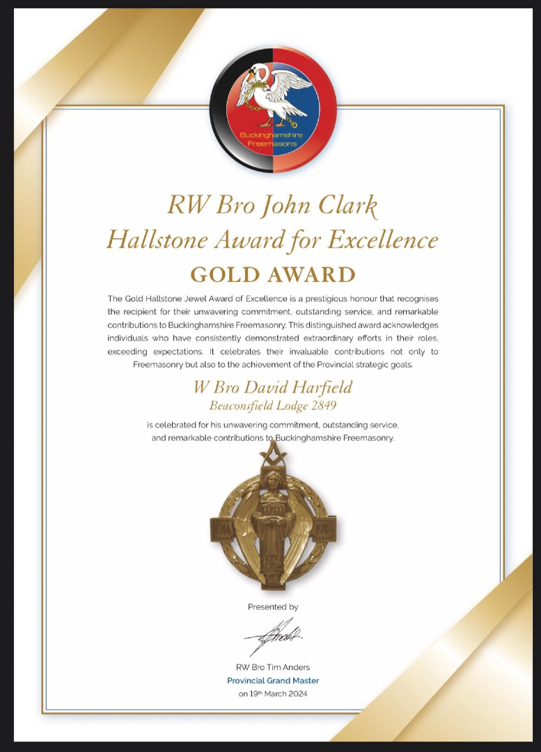 - This year awarded to Worshipful Brother David Harfield of Beaconsfield Lodge 2849