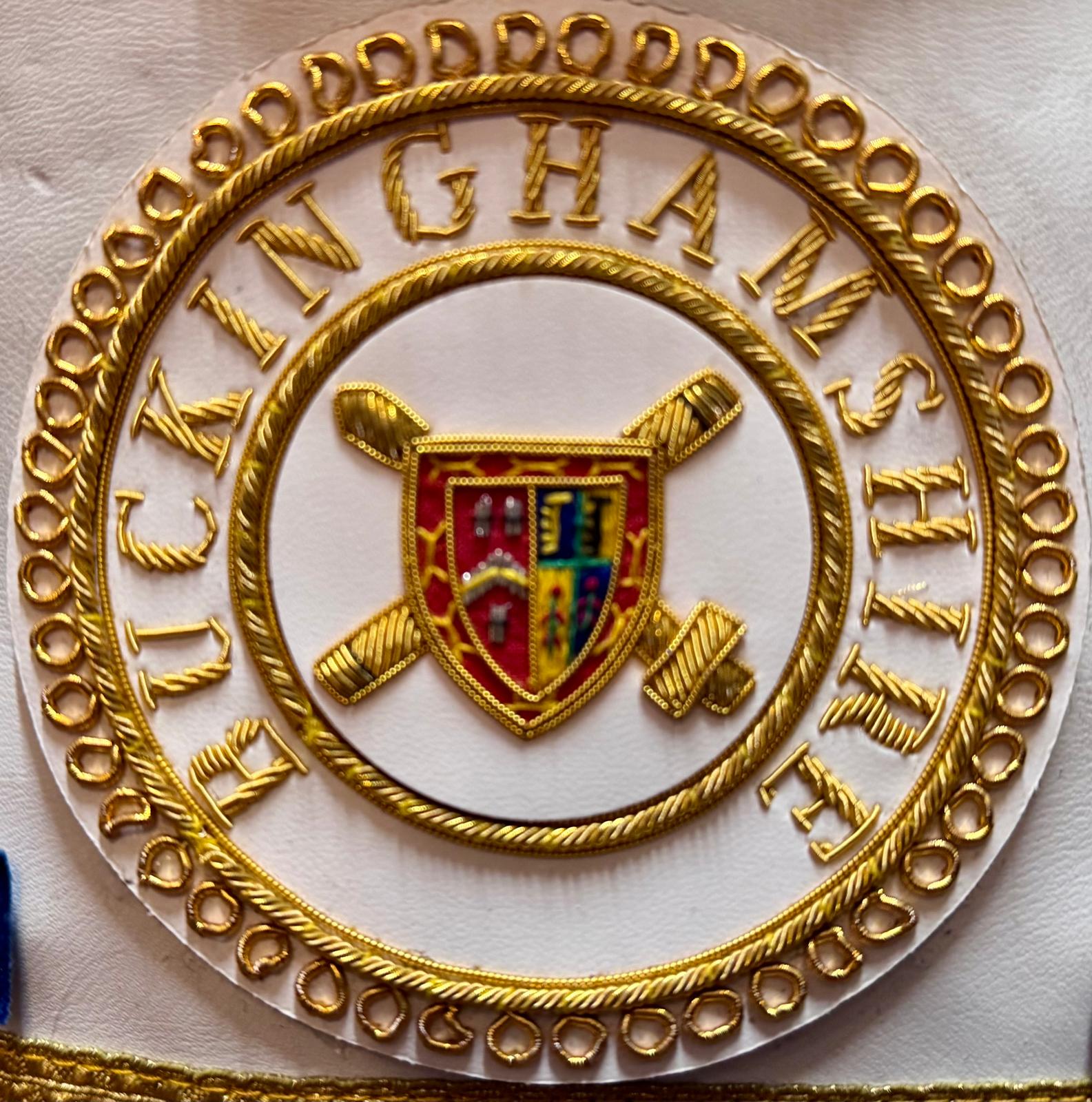 The badge of a Provincial Grand Pursuivant is distinctive and symbolic. At its centre sits the Arms of Grand Lodge overlaid with a crossed sword and wand. The sword represents vigilance and protection, while the wand symbolises authority and duty. These crossed emblems are traditionally associated with heralds and messengers, which aligns perfectly with the Pursuivant’s role as a ceremonial guardian and aide.