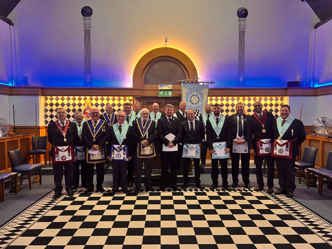 Initiations started at 9am and carried on throughout the day, and like something out of an ’80s game show, (think Challenge Anneka), the Provincial Grand Master and his team of provincial officers were on a high-energy mission, travelling across the county to witness as many initiation ceremonies as possible. Their commitment and enthusiasm meant they could be seen appearing in photos from numerous centres, showing support, celebrating with new initiates, and strengthening the connection across the province.