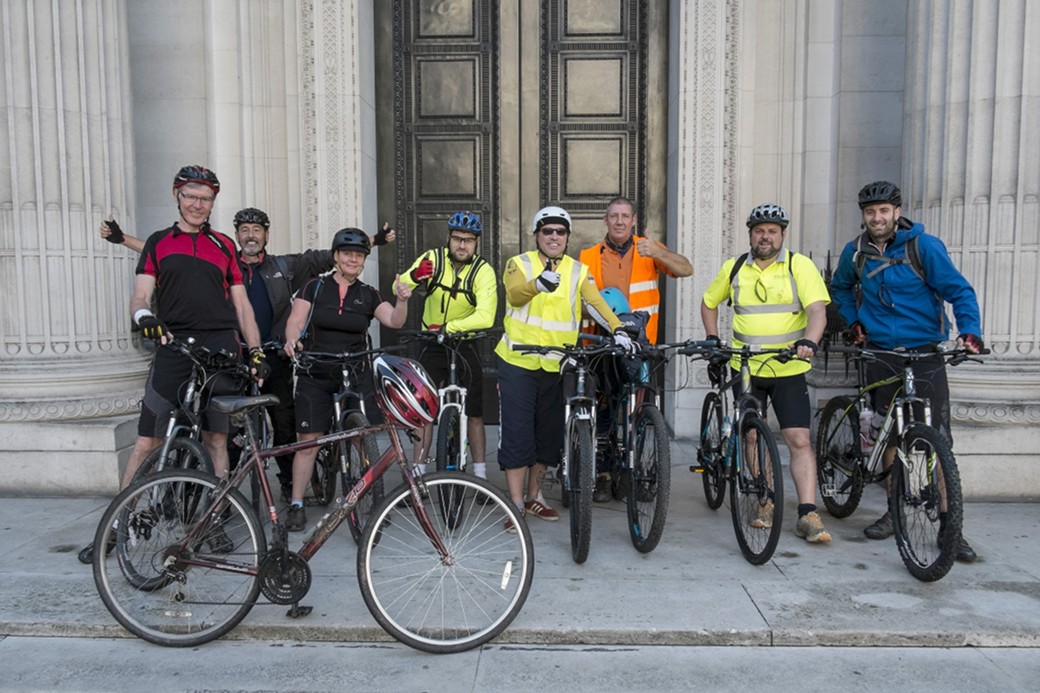 The actual day arrived more quickly than expected; one minute we were drinking beer in the Bell, in Winslow, discussing hi-vis jackets and the next moment we found ourselves on the first train from Bletchley into London. We rode the few miles from Euston Station to Great Queen Street and stopped briefly to adjust saddles, take pictures and prepare; one of our contingent gave some change to a homeless man sleeping on the steps of Freemasons’ Hall – this somehow set the tone for the day.